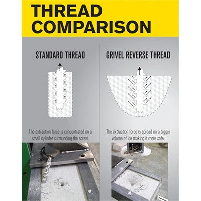 Ice Screws can be hard to trust at the best of times, so you may as well place your trust in a screw with the greatest holding power. Grivel ice screws use reverse thread where the angle of the thread faces away from the direction of pull. Although this seams counterintuitive at first, it has been shown both by independent testing and Grivel to spread more load onto a greater surface area of ice and therefore giving it greater holding power (see pictures for more details).