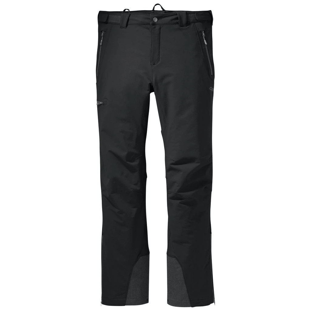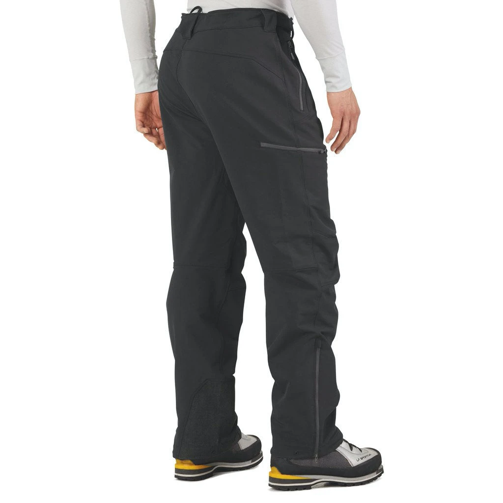 The OR Cirque Pants are a soft-shell pant that is highly wind and water resistant while having awesome breathability. It has 4-way stretch and is durable enough for climbing or back country skiing. The key thing about this pant is that it is breathable enough to wear on the valley approaches when temperatures might be around 15ยบC, but is weather proof enough to be trudging up a snow slope at -15ยบC. They can also be boosted in warmth with some thermal long johns if needed.ย